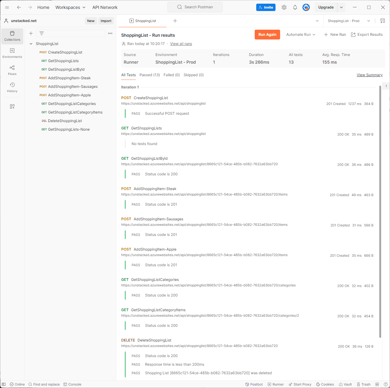 The Post-response tab can actually do test assertions and even make further API calls. The script below is for the DeleteShoppingList request: