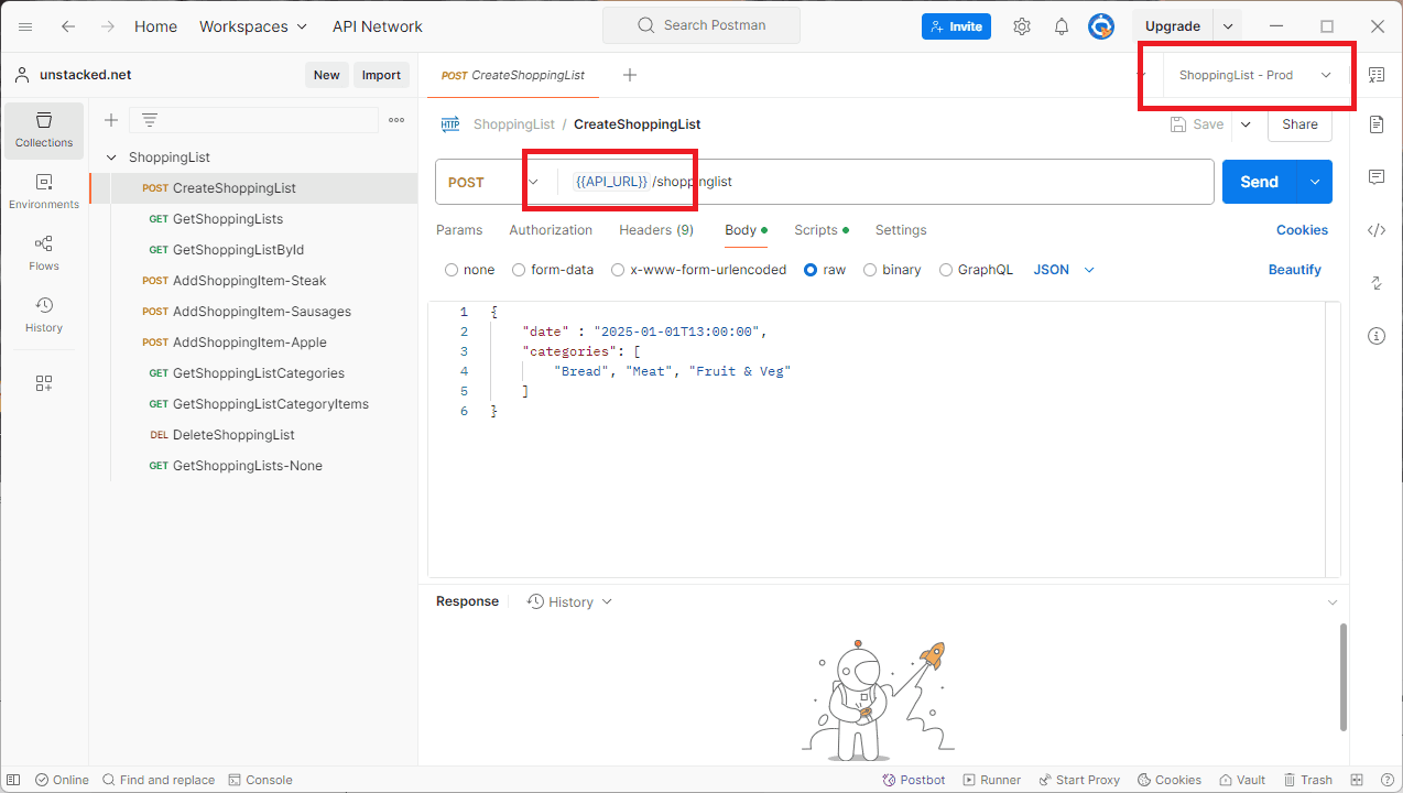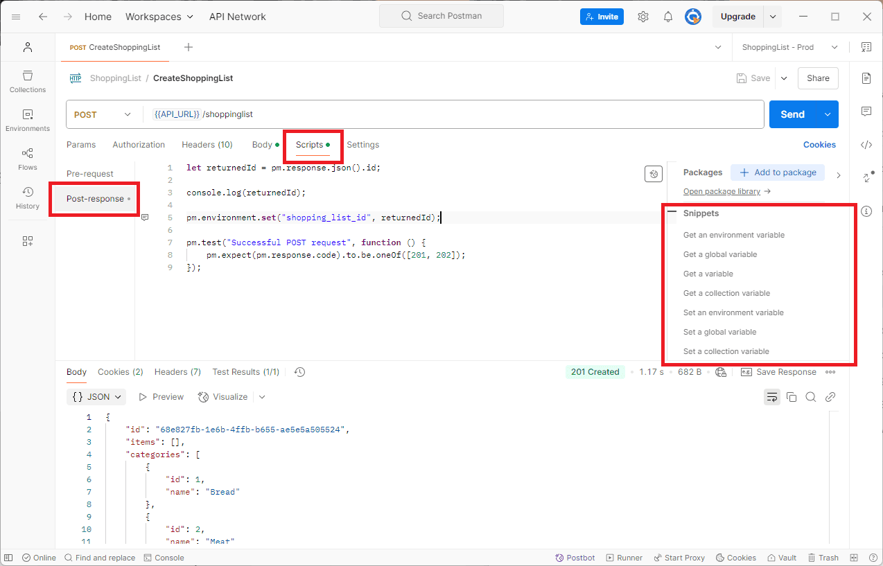 When the above request was made the id value 68e827fb-1e6b-4ffb-b655-ae5e5a505524 was set in the shopping_list_id variable. This variable can then be referenced in subsequent requests to, for example add items to the shopping list.