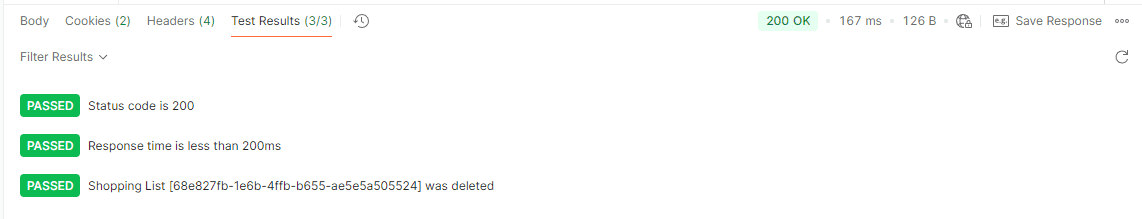 pm.test("Status code is 200", function () {pm.response.to.have.status(200);});let apiUrl = pm.environment.get("API_URL");let shoppingListId = pm.environment.get("shopping_list_id");let endpoint = `${apiUrl}/shoppinglist${shoppingListId}`;console.log(endpoint);console.log(shoppingListId);pm.sendRequest(endpoint, function (err, res) {pm.test(`Shopping List [${shoppingListId}] was deleted`, function () {pm.expect(res.code).to.equal(404);});});pm.test("Response time is less than 200ms", function () {pm.expect(pm.response.responseTime).to.be.below(200);});