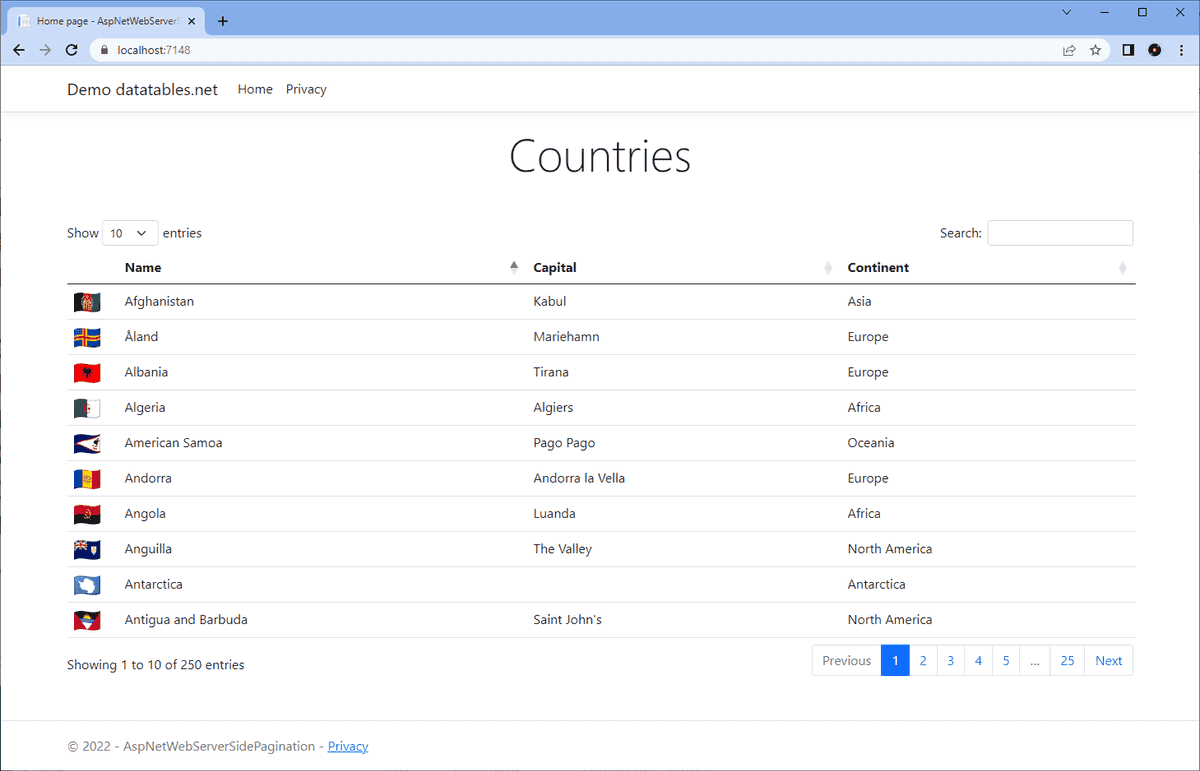 Adding in the above code excerpts implements the code for server-side pagination, searching and sorting. The grid actually looks the same as in the screenshot above. To finish off lets replace the first column, the country code, with the countries flag.