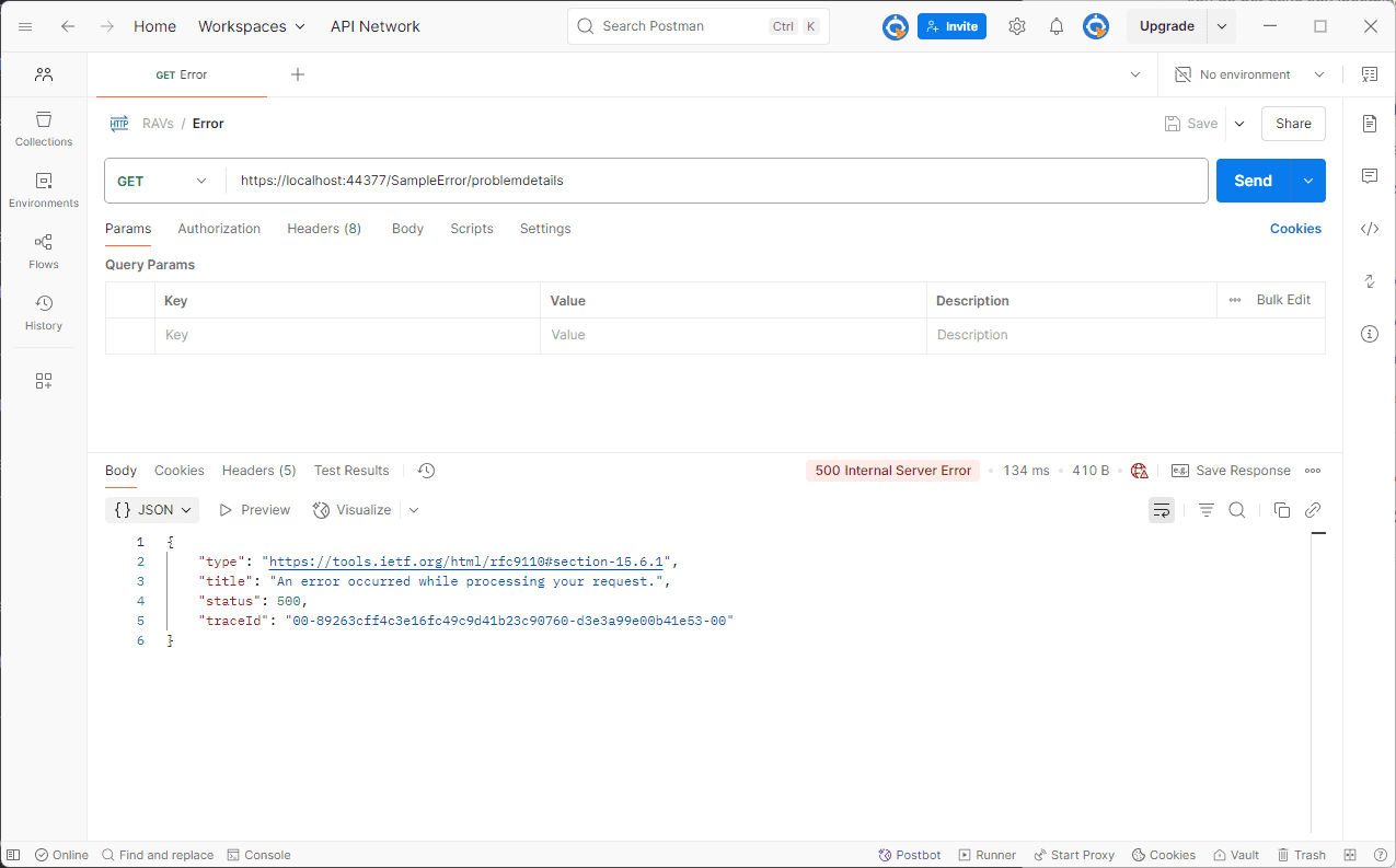 If we hit this endpoint then we get a 500 internal status code with the stack trace returned as the body of the response: