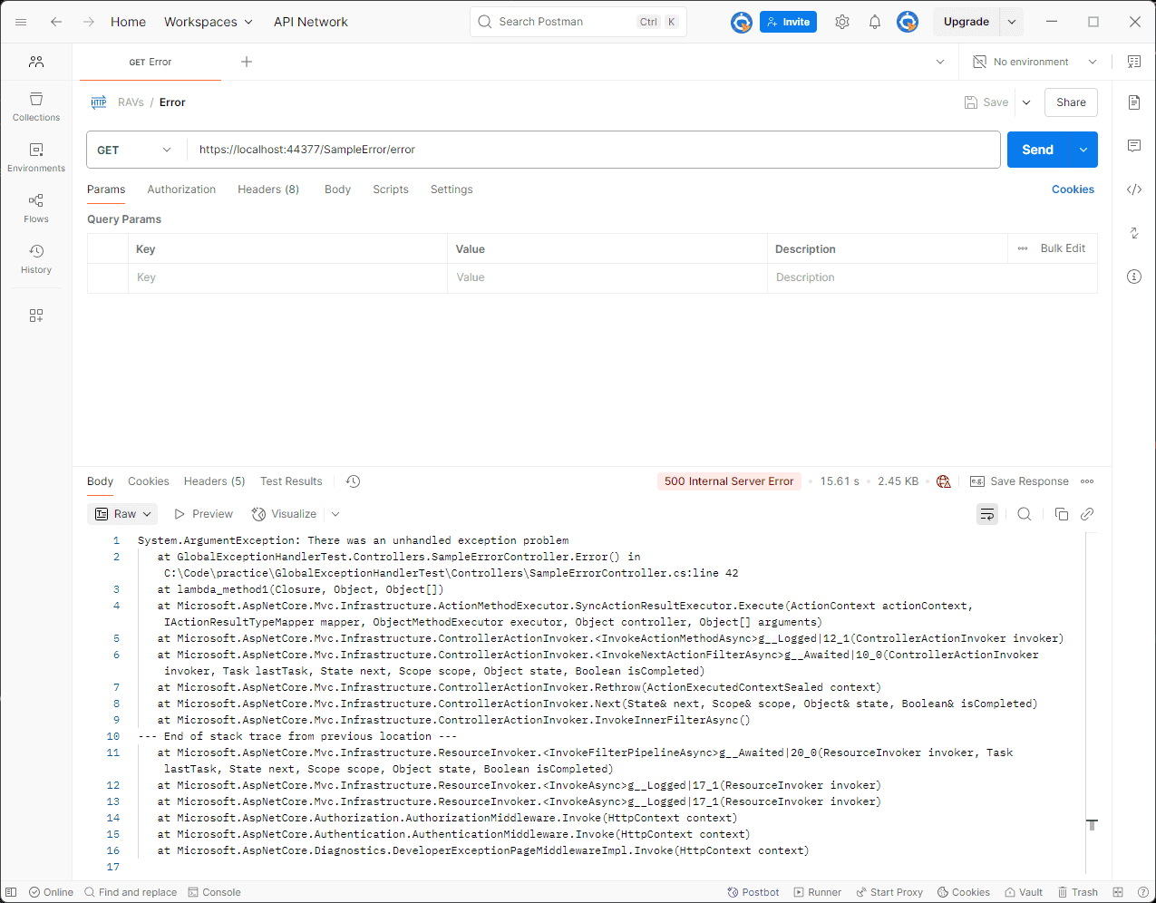fail: Microsoft.AspNetCore.Diagnostics.ExceptionHandlerMiddleware[1]An unhandled exception has occurred while executing the request.System.ArgumentException: There was an unhandled exception problemat GlobalExceptionHandlerTest.Controllers.SampleErrorController.Error() in C:\Code\practice\GlobalExceptionHandlerTest\Controllers\SampleErrorController.cs:line 42at lambda_method1(Closure, Object, Object[])at Microsoft.AspNetCore.Mvc.Infrastructure.ActionMethodExecutor.SyncActionResultExecutor.Execute(ActionContext actionContext, IActionResultTypeMapper mapper, ObjectMethodExecutor executor, Object controller, Object[] arguments)fail: GlobalExceptionHandlerTest.Handlers.GlobalExceptionHandler[0]An unhandled exception occurred.System.ArgumentException: There was an unhandled exception problemat GlobalExceptionHandlerTest.Controllers.SampleErrorController.Error() in C:\Code\practice\GlobalExceptionHandlerTest\Controllers\SampleErrorController.cs:line 42at lambda_method1(Closure, Object, Object[])at Microsoft.AspNetCore.Mvc.Infrastructure.ActionMethodExecutor.SyncActionResultExecutor.Execute(ActionContext actionContext, IActionResultTypeMapper mapper, ObjectMethodExecutor executor, Object controller, Object[] arguments)