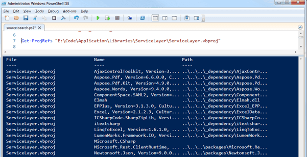 This time round we are parsing the XML directly and returning a custom PowerShell object which includes the data we need. In the results below, we can see some references to a _dependency folder, presumably these are checked into source control. We can also see the packages folder referenced as well as a single blank Path – this is a .NET framework library: