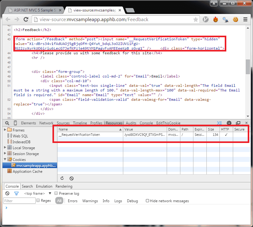 So now, a token has been generated both in a hidden input field on the form AND as a cookie. If BOTH of these values are not present in the request, and with matching values then a HttpAntiForgeryException is thrown by the framework and the controller in question is not executed.