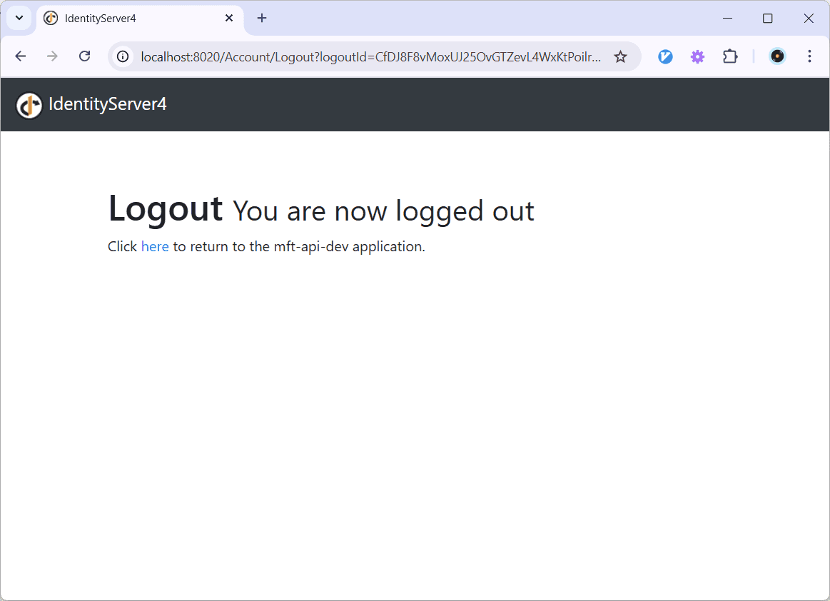 To get the “click here” line to appear, I added the signout callback url of the sample website http://localhost:5077/signout-callback-oidc to the PostLogoutRedirectUris in the config.js of Identity Server. Clicking the here link will redirect you to the signed out page.