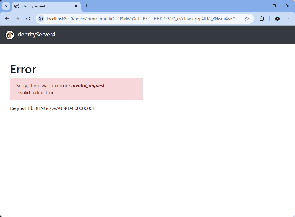 If you now run the app you will get redirected to the IAM server when you try to browse to this Secure page. However, do be aware that IAM server will need to have the redirect URI listed. This is dependant on the implementation, but if you used Identity Server as outlined in my previous blog post you do get some useful debug messages: