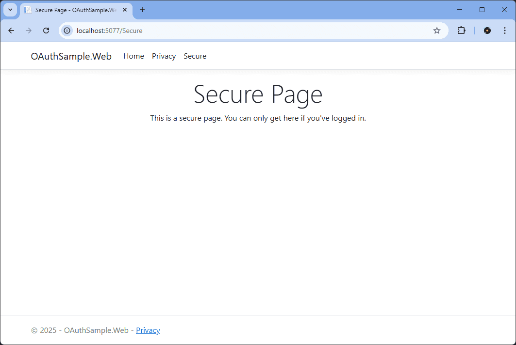 using Microsoft.AspNetCore.Authorization;using Microsoft.AspNetCore.Mvc.RazorPages;namespace OAuthSample.Web.Pages;[Authorize]public class SecureModel : PageModel{private readonly ILogger<IndexModel> _logger;public SecureModel(ILogger<IndexModel> logger){_logger = logger;}public void OnGet(){_logger.LogInformation("The secure page was accessed!");}}