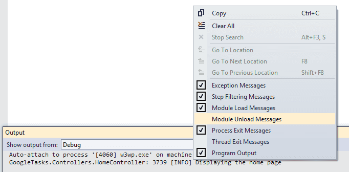 Finally if you are using the Visual Studio output window, its worth knowing that you can right click and turn off the white noise: